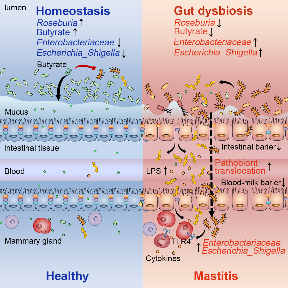 张乃生/付云贺课题组通过对奶牛乳腺炎临床病例进行研究,发现乳腺炎奶牛发生显著肠道菌群和乳腺菌群紊乱,肠杆菌科细菌在肠道和乳腺富集;将乳腺炎奶牛(而非健康奶牛)的粪便微生物移植给小鼠可诱导小鼠乳腺炎和系统性炎症,导致小鼠肠道菌群和乳腺菌群紊乱,促进肠道细菌跨“肠-乳轴”向乳腺迁移,而补充共生罗氏菌属可通过产生丁酸缓解肠道菌群诱导的乳腺炎发生。相关研究成果于11月22日在线发表于国际学术期刊《Cell Reports》《Commensal cow Roseburia reduces gut-dysbiosis-induced mastitis through inhibiting bacterial translocation by producing butyrate in mice》。本研究证实课题组之前提出的“内源性乳腺炎”这一病理学假设,并表明细菌迁移或是肠道菌群紊乱跨“肠-乳轴”诱导乳腺炎发生的潜在机制之一,这为深入认识和破解乳腺炎发病机制,以及靶向“肠-乳轴”防治乳腺炎提供了理论指导。