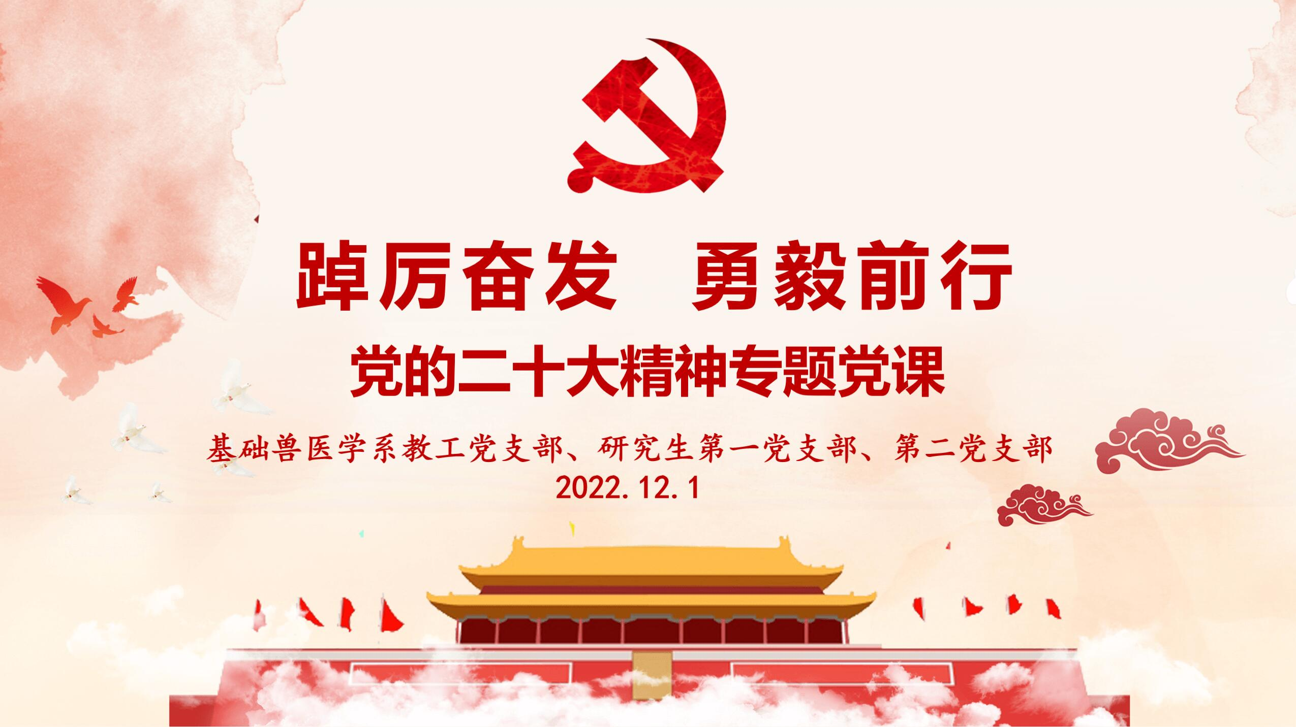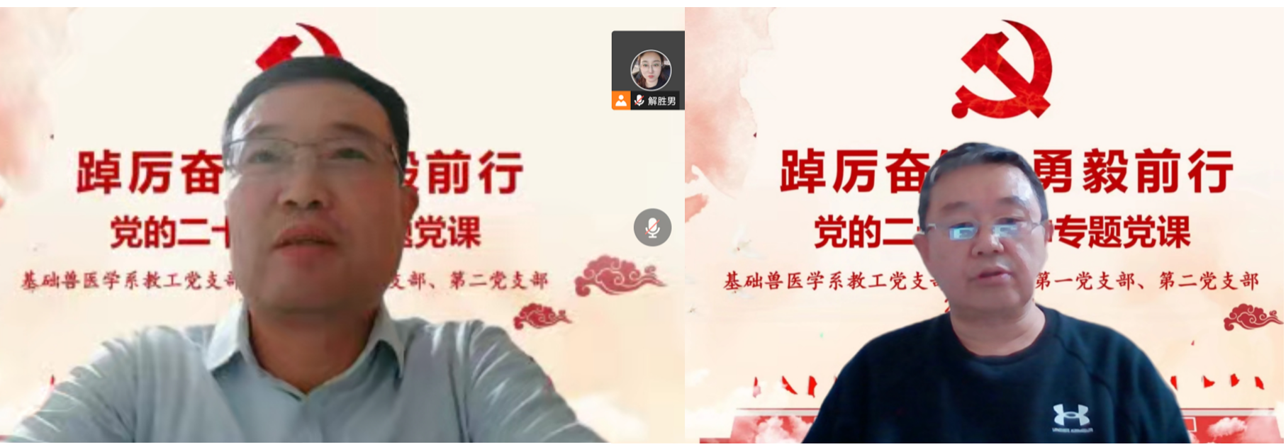 副院长贺文琦教授主讲党课。基础兽医学系教工党支部、研究生第一党支部、第二党支部全体党员及入党积极分子90余人参加线上活动。