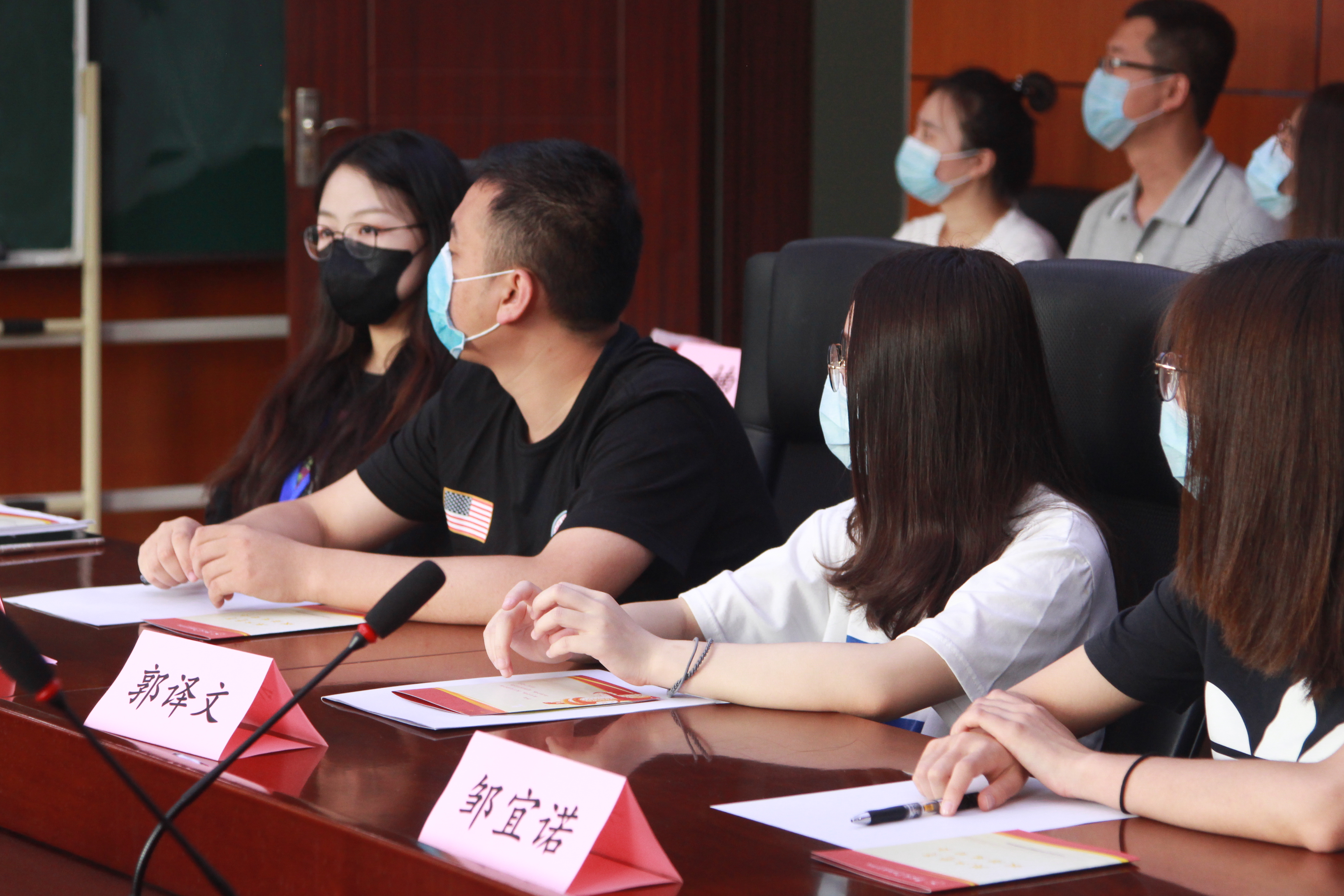 会议在庄严的《国际歌》中拉开序幕。 重温入党誓词“我志愿加入中国共产党…….”毕业生党员语言铿锵有力,声声震耳,现场顿时燃起了信仰的力量。接下来,栾志伟老师、饶家辉老师为毕业生党员颁发党员政治生日贺卡。这是疫情下的一份特殊纪念,也是毕业生党员的一张明信片,期望同学们,不忘初心奉献芳华,砥砺前行不负青春。