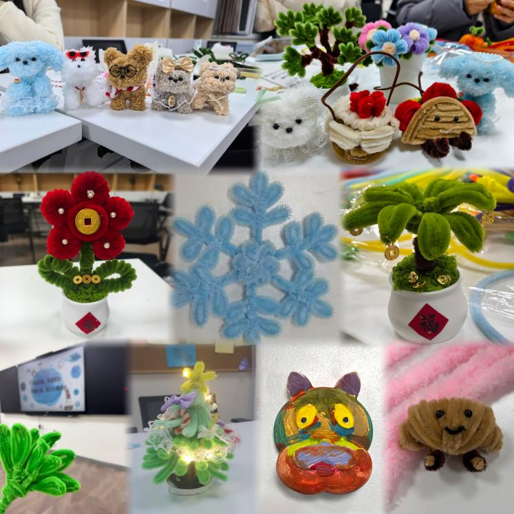 活动最后,同学们手捧着自己亲手编织的作品和绘制的石膏娃娃,满怀成就地与自己的作品打卡互动,也与其他同学分享着那份喜悦和满满的成就感。