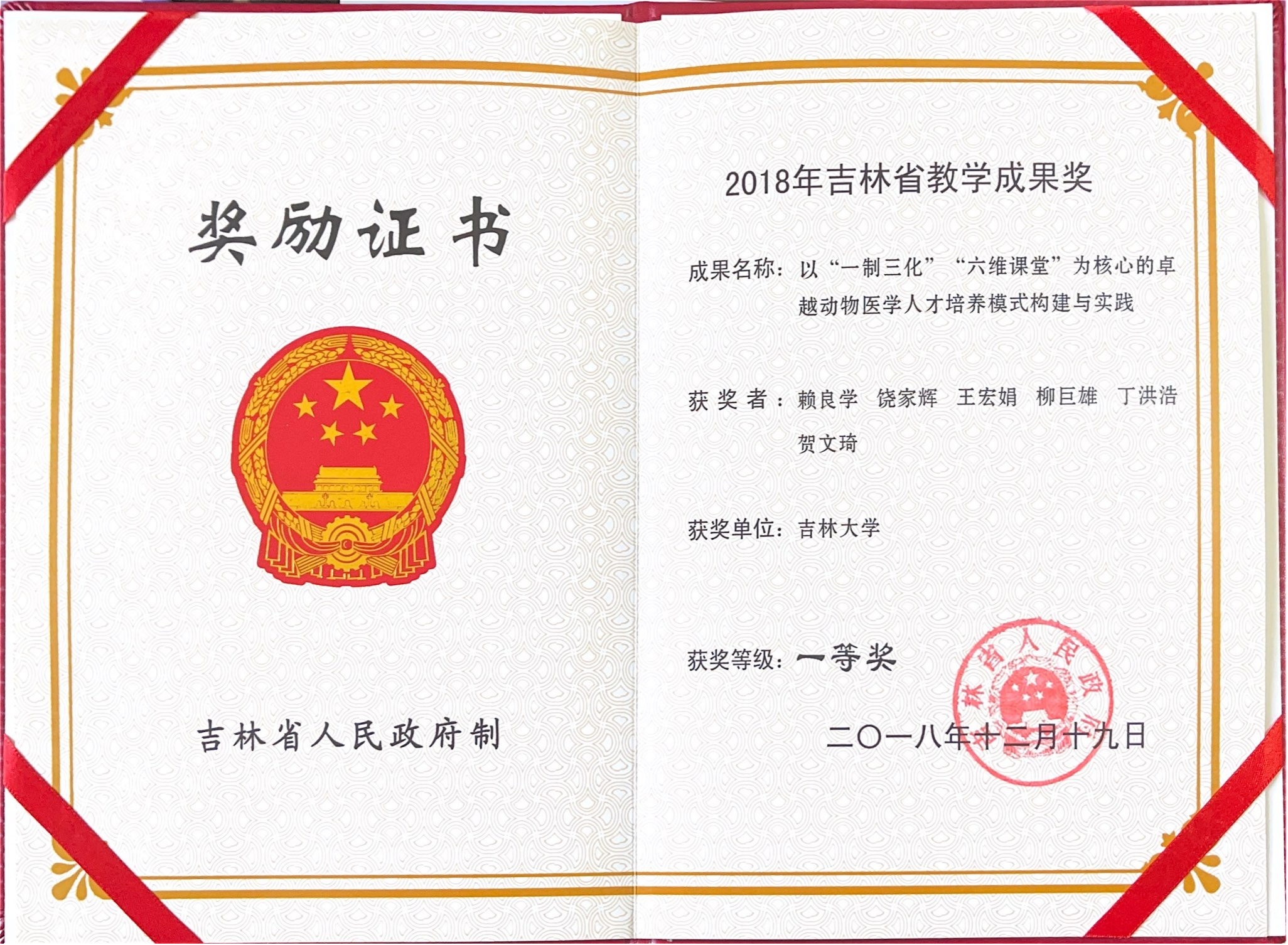 教学成果特等奖、吉林省教学成果一、二等奖各1项。
