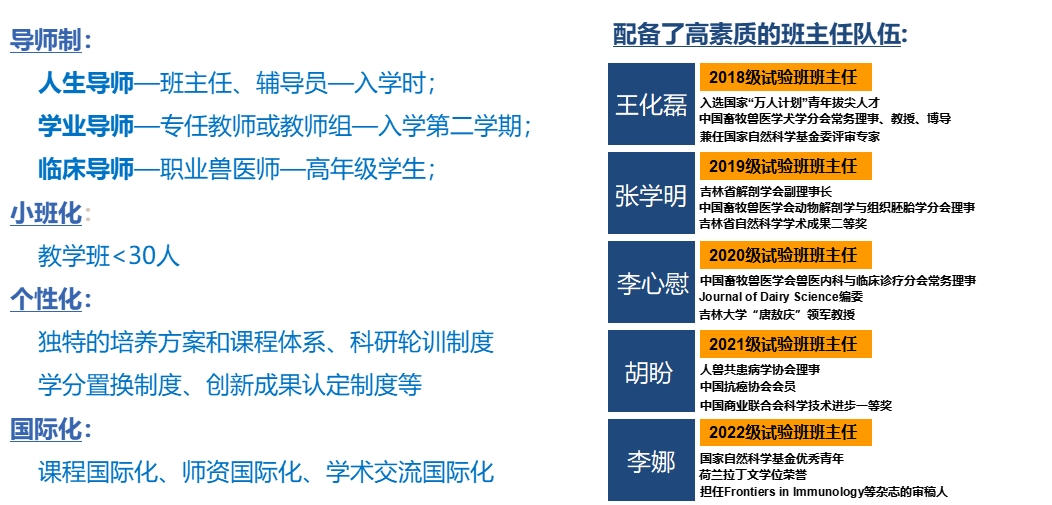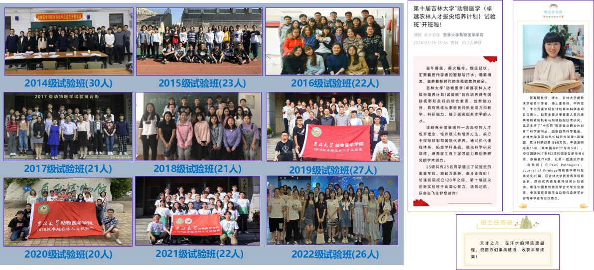 2014年试办卓越人才培养试验班,实行“一制三化”:导师制、小班化、个性化、国际化,现组建10期,累计237名学生,目前读研率为98%,出国交流率41%,科研参与率100%,发表SCI论文影响因子总数154.95,获国家级竞赛奖项59项。以2024届动物医学(卓越农林人才拔尖培养计划)试验班为例,班级27名学生,英语四六级通过率为100%,85%的同学被推免到清华、北大、中科院等双一流A类大学或科研院所,2人入选DVM项目,班级被评为“2023年av动漫
